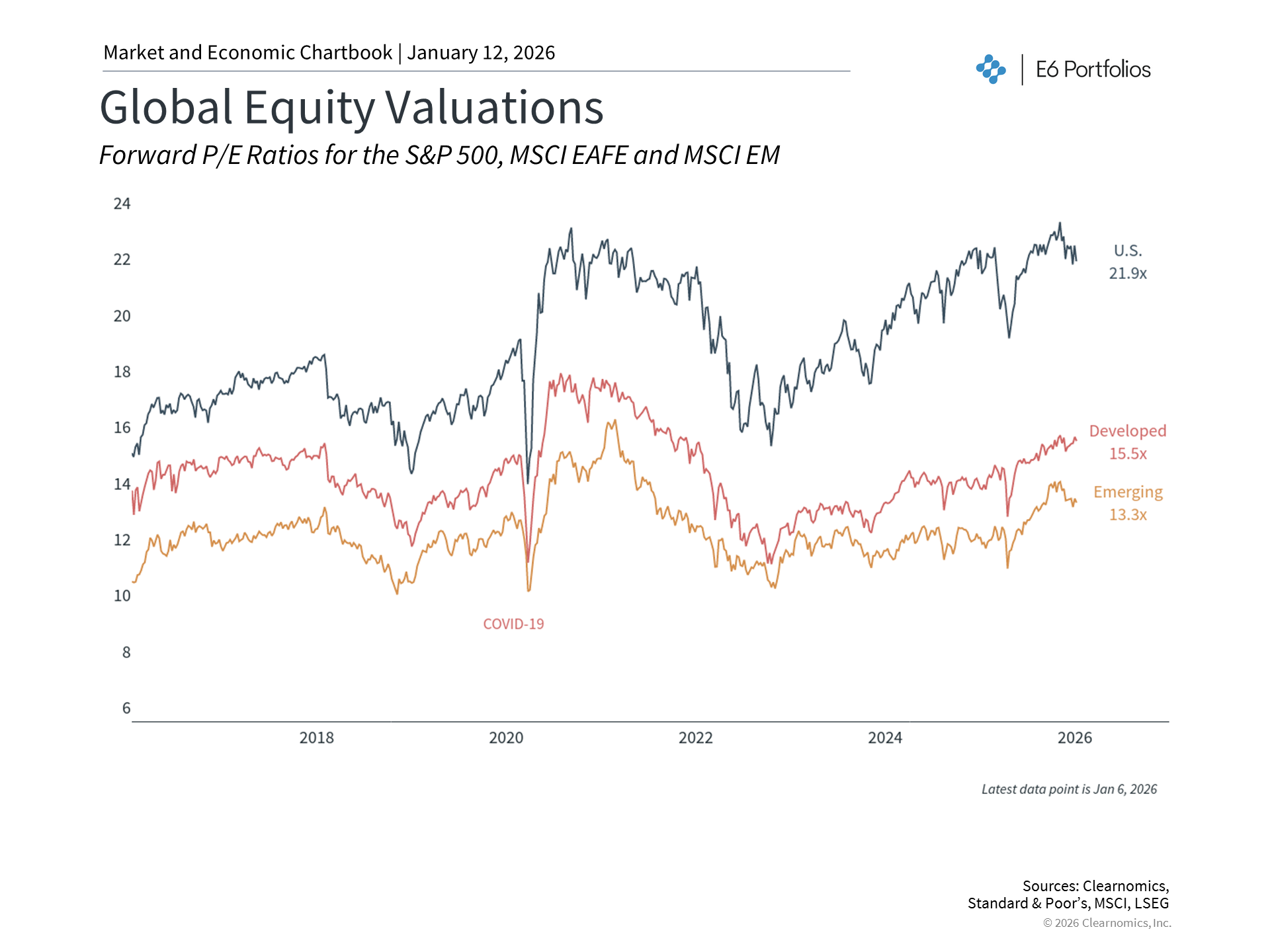 The chart shows that international stocks currently trade at lower prices compared to their earnings than U.S. stocks. This could make them attractive additions to a portfolio. Market leadership changes over time, so spreading investments across different regions can help create more consistent results.