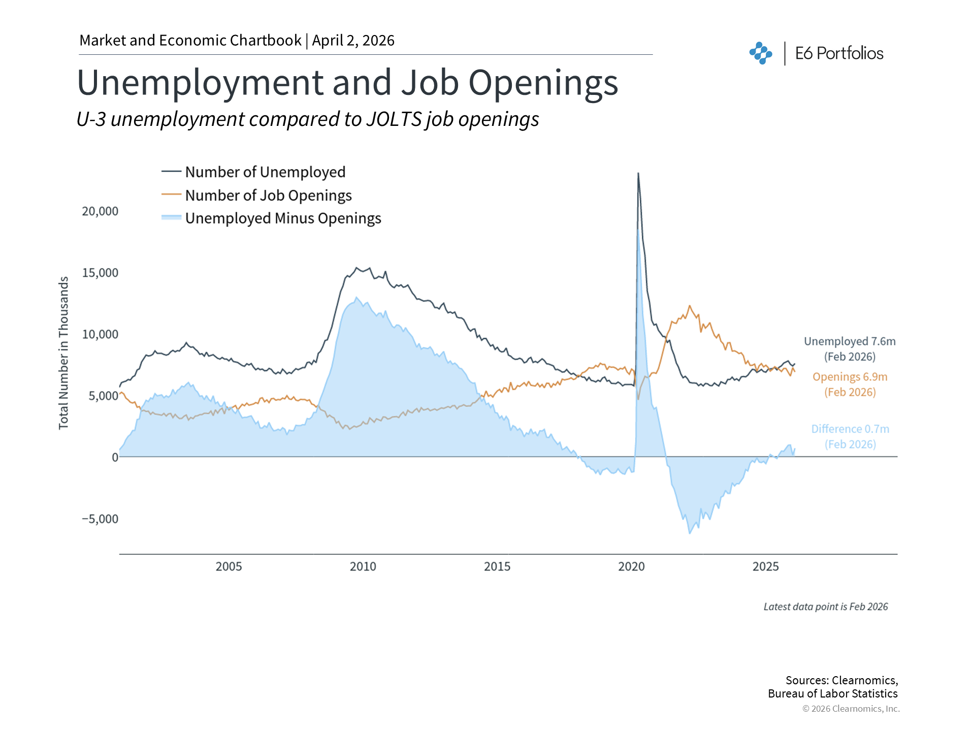 The labor market remains a key area of focus. The latest payrolls data show that February job gains fell by 92,000 and the unemployment rate edged up to 4.4%. Notably, job seekers now outnumber job openings for the first time in years. As recently as 2022, there were two job openings for every unemployed individual, reflecting an exceptionally tight labor market. That relationship has now reversed.