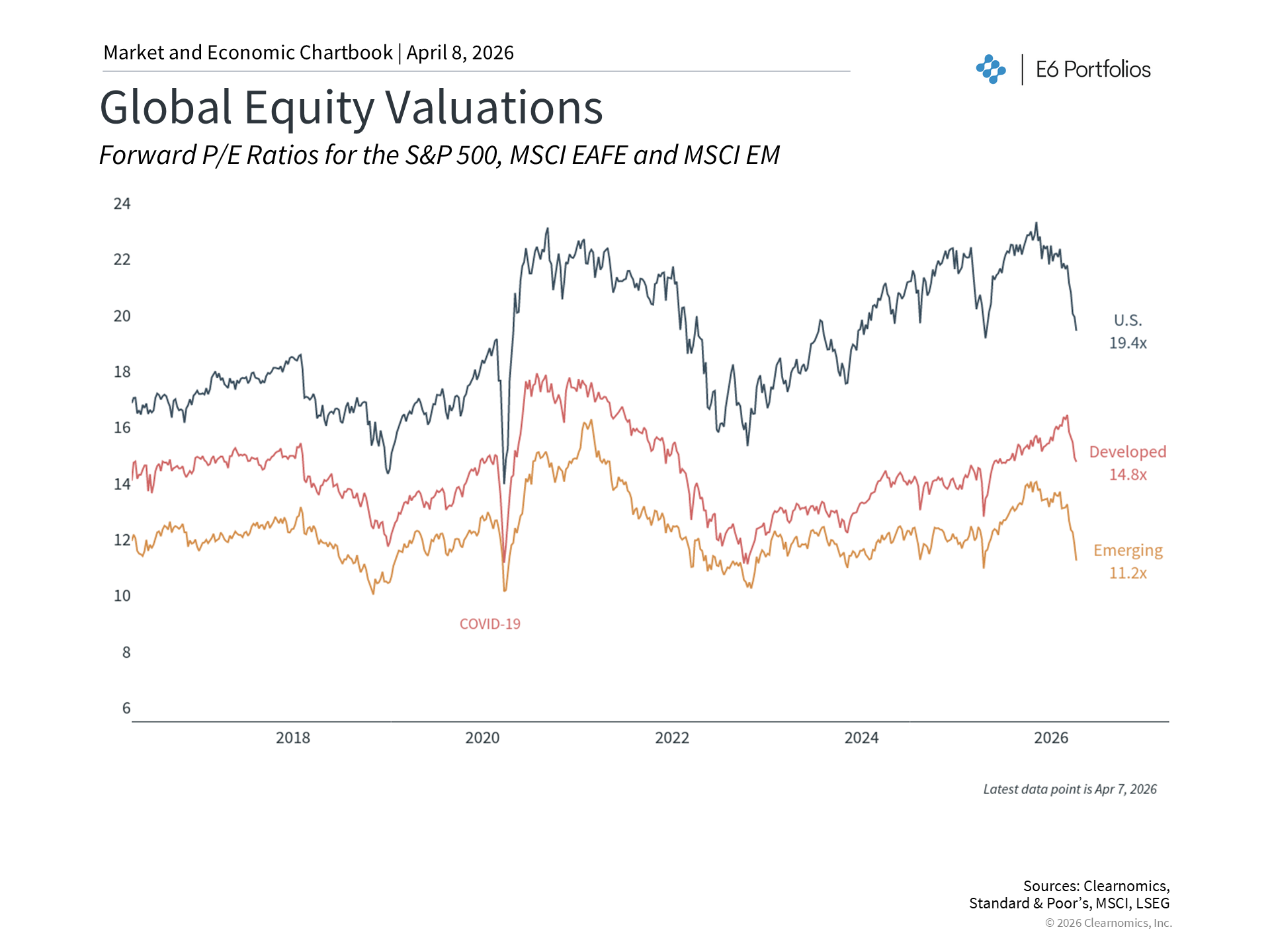 International stocks also tend to be less expensive than U.S. stocks based on valuation measures like the price-to-earnings ratio (P/E) — which compares a stock’s price to its earnings and is a common way to assess whether stocks are cheap or expensive. Developed markets currently trade at a P/E of 14.9x and emerging markets at 11.8x, compared to 19.9x for the S&P 500. While lower valuations don’t predict short-term performance, they are a useful input when building a balanced portfolio.