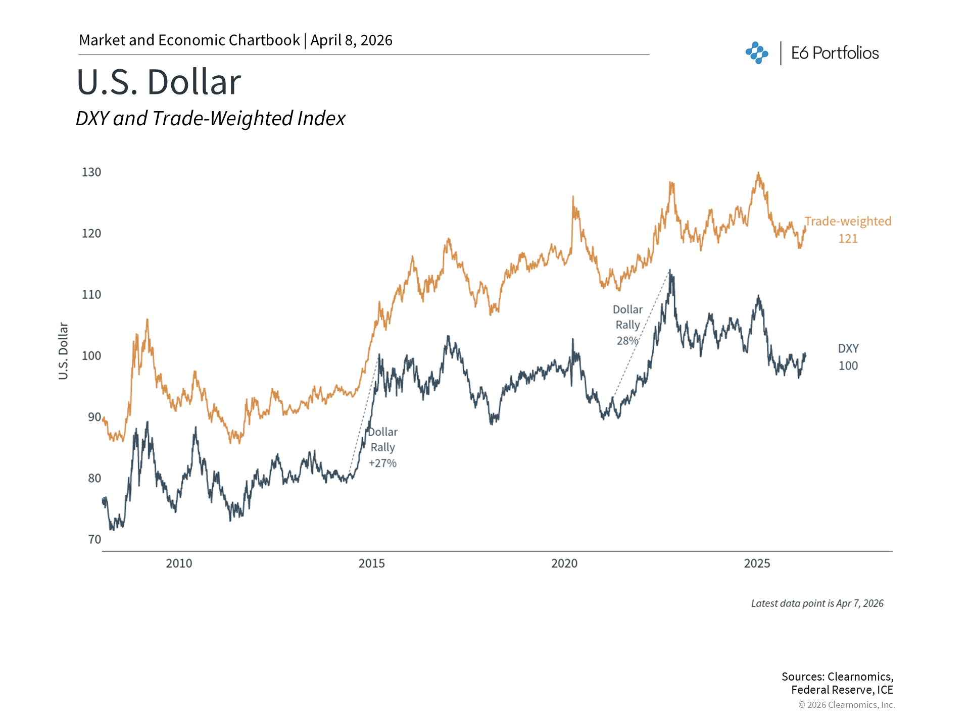 The dollar hit a peak around 114 on the dollar index (DXY) in 2022, then gradually weakened as global growth stabilized. Last year, tariffs pushed it below 100 for the first time in three years. More recently, the dollar has bounced back as investors have sought safety during times of global uncertainty. Even so, the dollar remains stronger than it has been through much of its history.